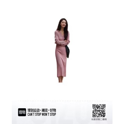 德玛纳 纯色V领套头修身长款针织长袖连衣裙 女款 皮粉