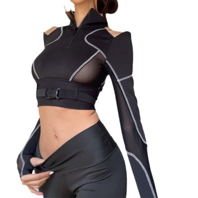 街头机车时尚网纱拼接露脐短款T恤辣妹露肩显瘦反车拼色透视上衣V