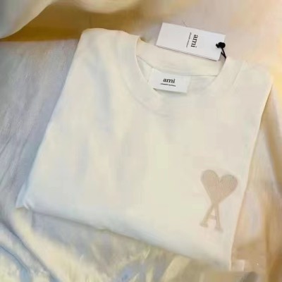 正确版Ami刺绣爱心短袖t恤马卡龙字母同色男女宽松纯棉情侣款半袖