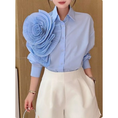 设计感小众百褶花朵衬衣上衣女早秋新款百搭休闲中长款polo领衬衫
