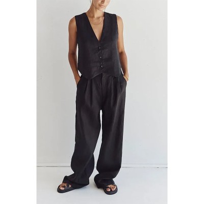 2023夏季新品跨境亚马逊独立站棉麻西装马甲阔腿裤时尚休闲套装女