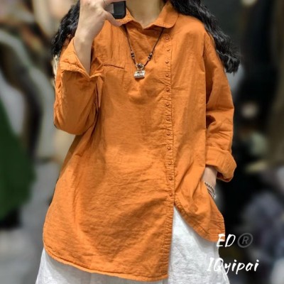 ed8952纯色复古棉麻斜门襟设计衬衫2023新款宽松休闲百搭长袖衬衣
