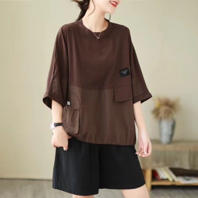 纯色拼接短袖 夏季新款圆领贴布宽松复古女士体恤百搭t恤套头上衣