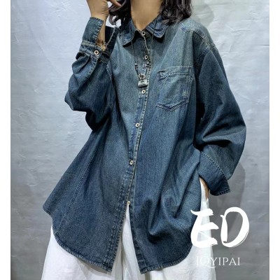 ed7207纯色洗水牛仔大版衬衫2024早春新品拼接时尚百搭衬衣女