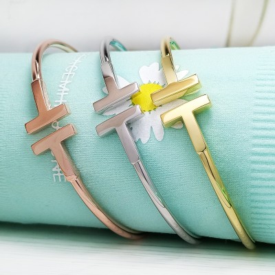 蒂梵芙尼S925纯银T家T字开口手环 欧美女士镶钻开口手镯 跨境货源